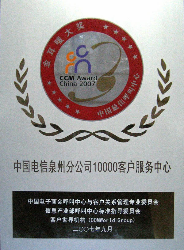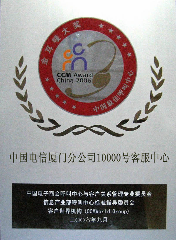 2008年中國(guó)最佳呼叫中心“金耳嘜大獎(jiǎng)”暨本年度亞太最佳呼叫中心評(píng)選頒獎(jiǎng)典禮于2008年10月16日在北京隆重舉行,本屆評(píng)審范圍涉及亞太地區(qū)十多個(gè)國(guó)家和地區(qū)的呼叫中心機(jī)構(gòu)。由庫(kù)易公司承建的福州10000號(hào)榮膺本屆“中國(guó)最佳呼叫中心”稱號(hào),至此,我司承建的呼叫中心已連續(xù)三年獲得此稱號(hào)。在2006年、2007年由庫(kù)易科技建設(shè)并維護(hù)的廈門(mén)10000號(hào)呼叫中心系統(tǒng)、泉州10000號(hào)呼叫中心系統(tǒng),憑借其穩(wěn)定的性能和專業(yè)的服務(wù),分別榮膺“2006年中國(guó)最佳呼叫中心”、“2007年中國(guó)最佳呼叫中心”稱號(hào)。